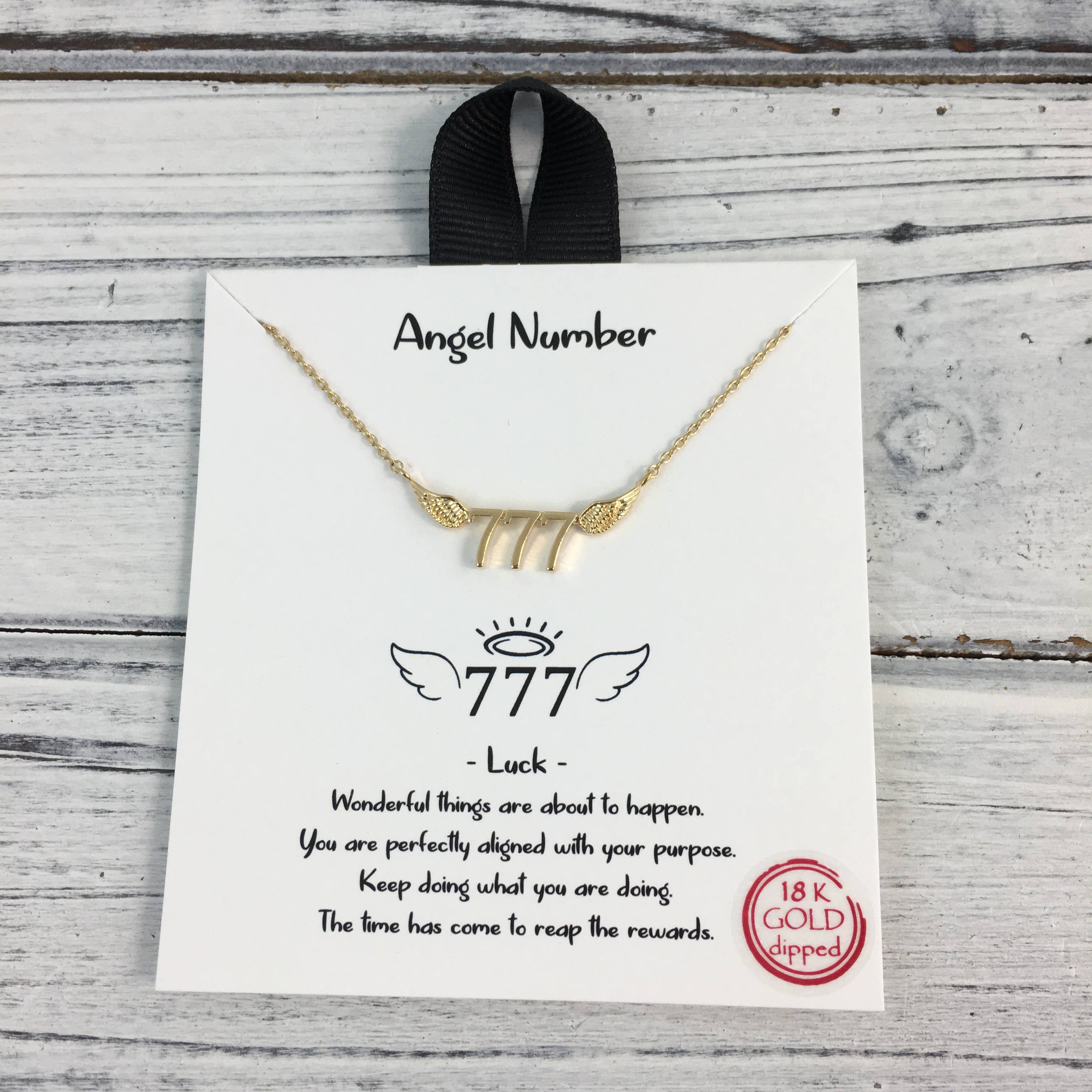 This necklace has an angel number 777 charm with beautiful wings! The packaging has a message about luck.