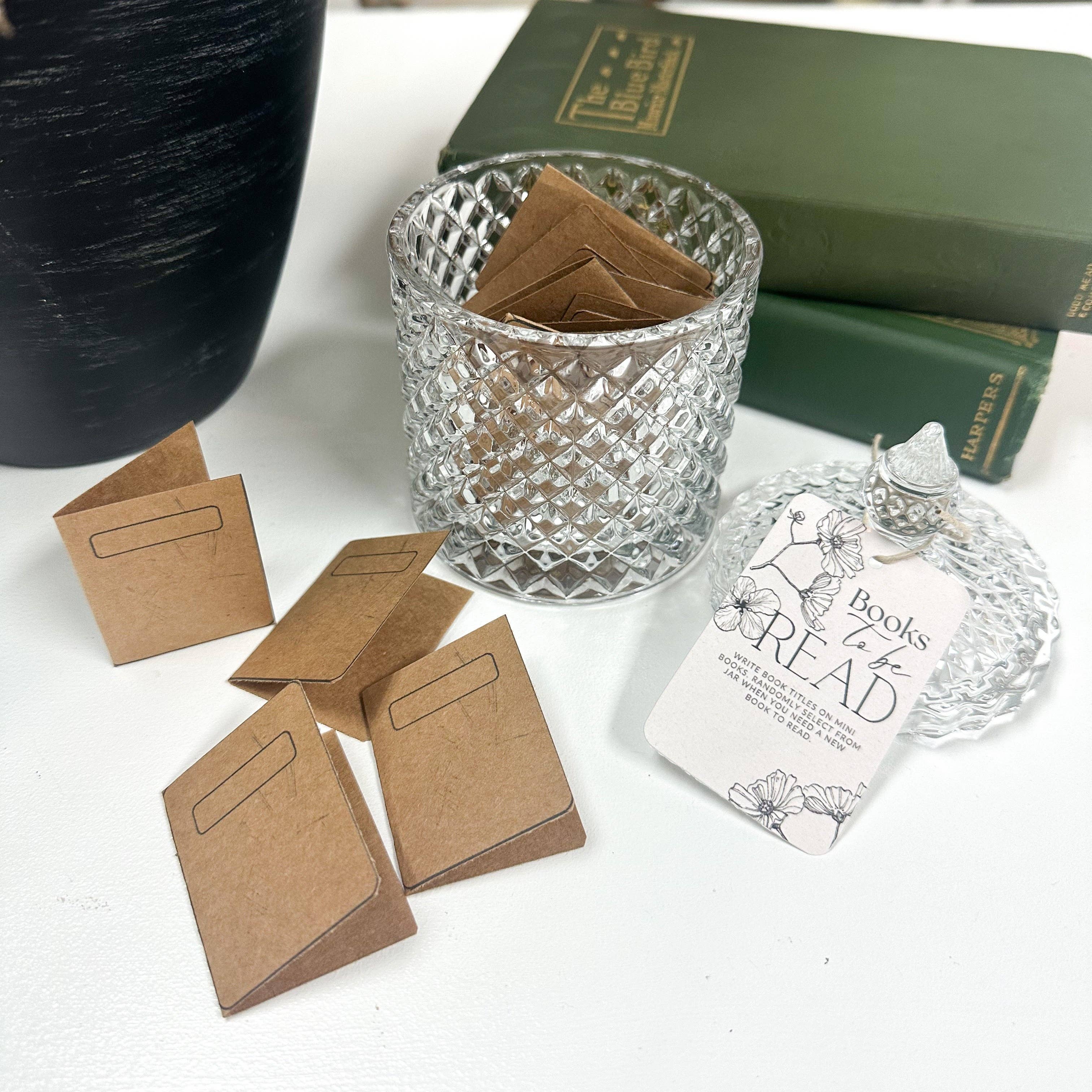 Stunning crystal glass jar with lid to organize the books you want to read. Includes folded cardstock mini books to write the title of book. When you are ready to read your next book, simply randomly pull your next read out of the jar!
