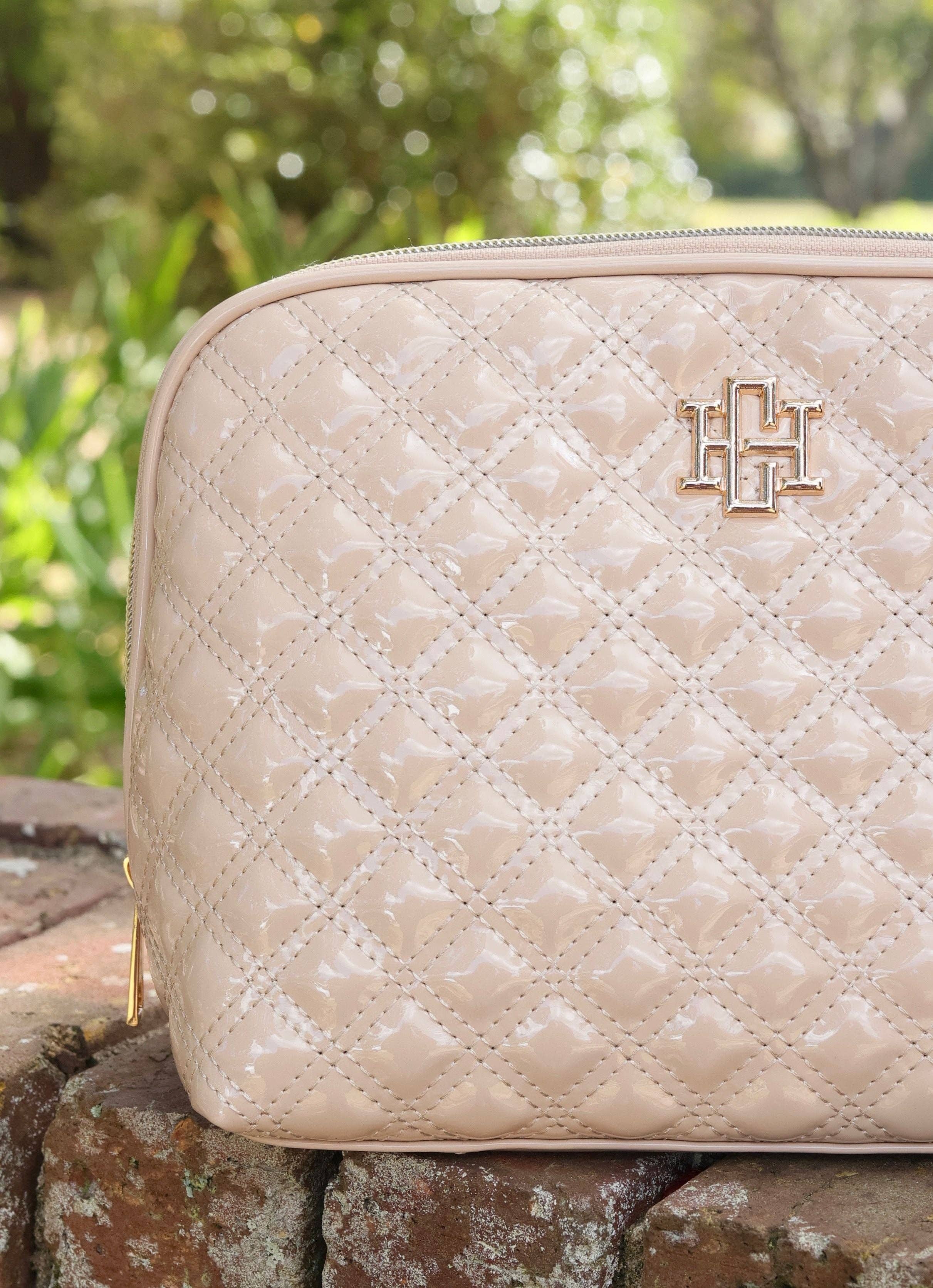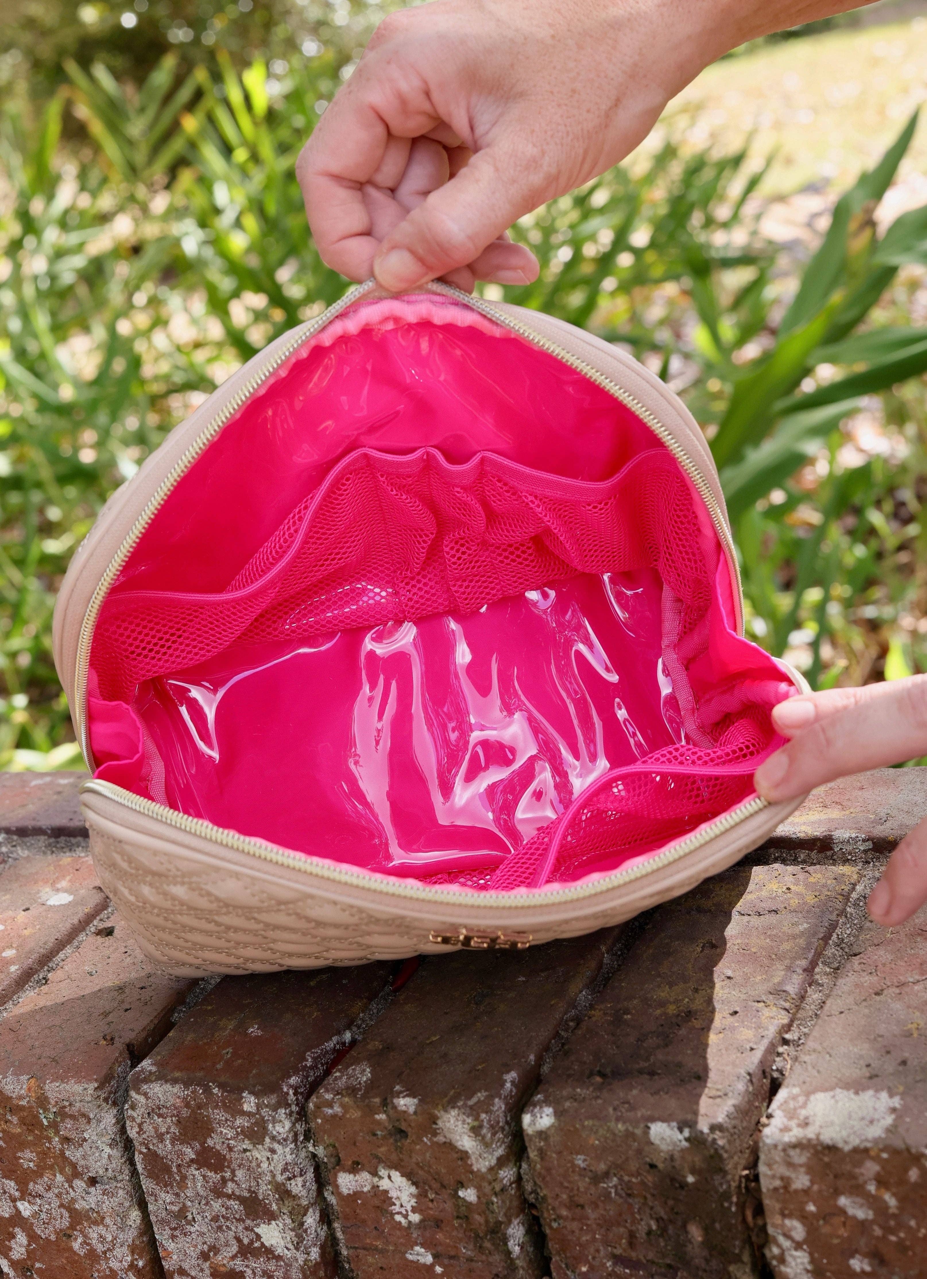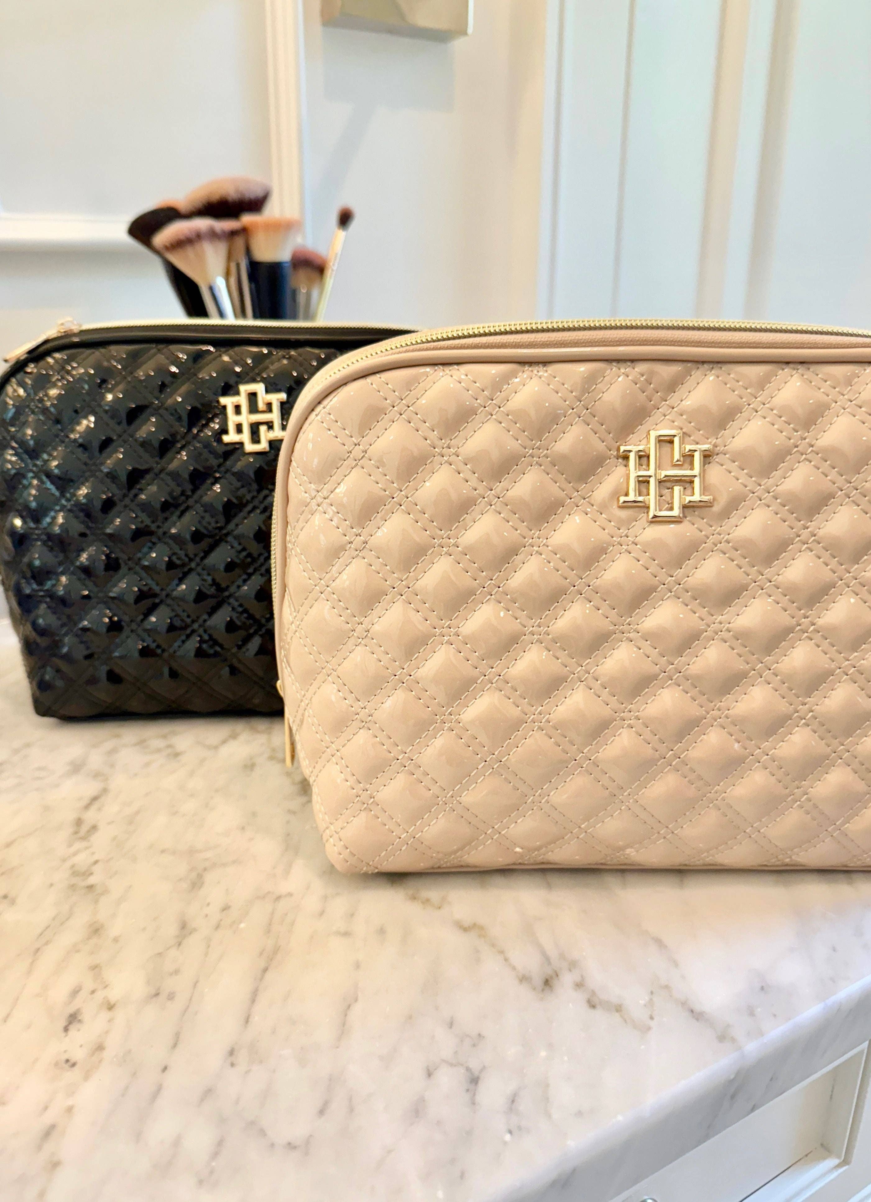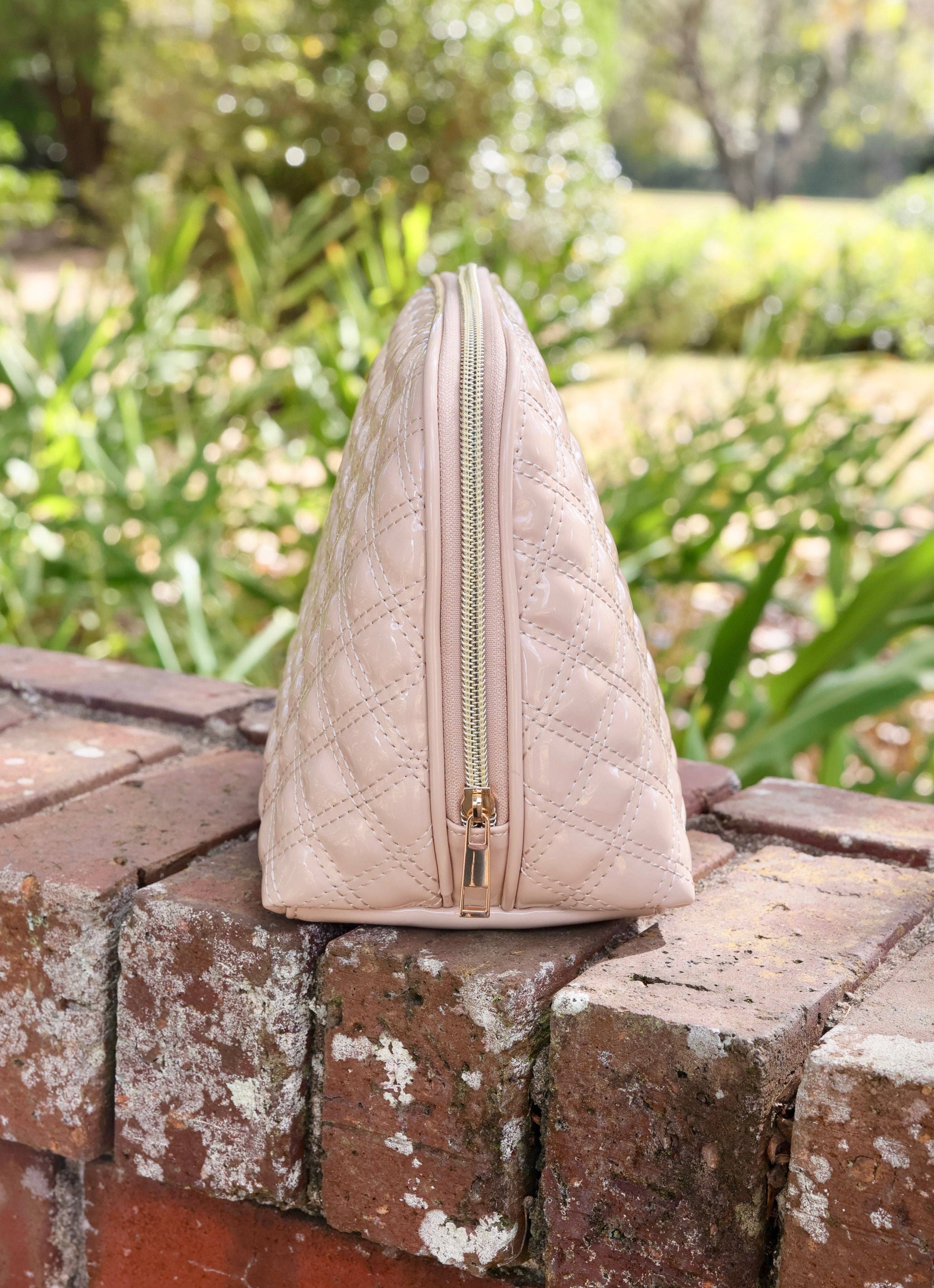 This beautiful vegan patent leather pouch is part of our makeup and travel collection and features a stylish quilted fabric design. The elongated zipper provides easy access, making it perfect for organizing makeup, toiletries, and hair accessories. The spacious interior is lined with hot pink with a clear protective fabric that is easily wipeable. It also has mesh pockets to keep cosmetics neatly stored and accessible.
