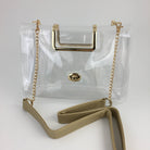 This is one of our fashionable, stadium approved Clear bags! It comes with a gold purse strap, as well as a gold handle attached to the bag. All clear purses have detachable straps.