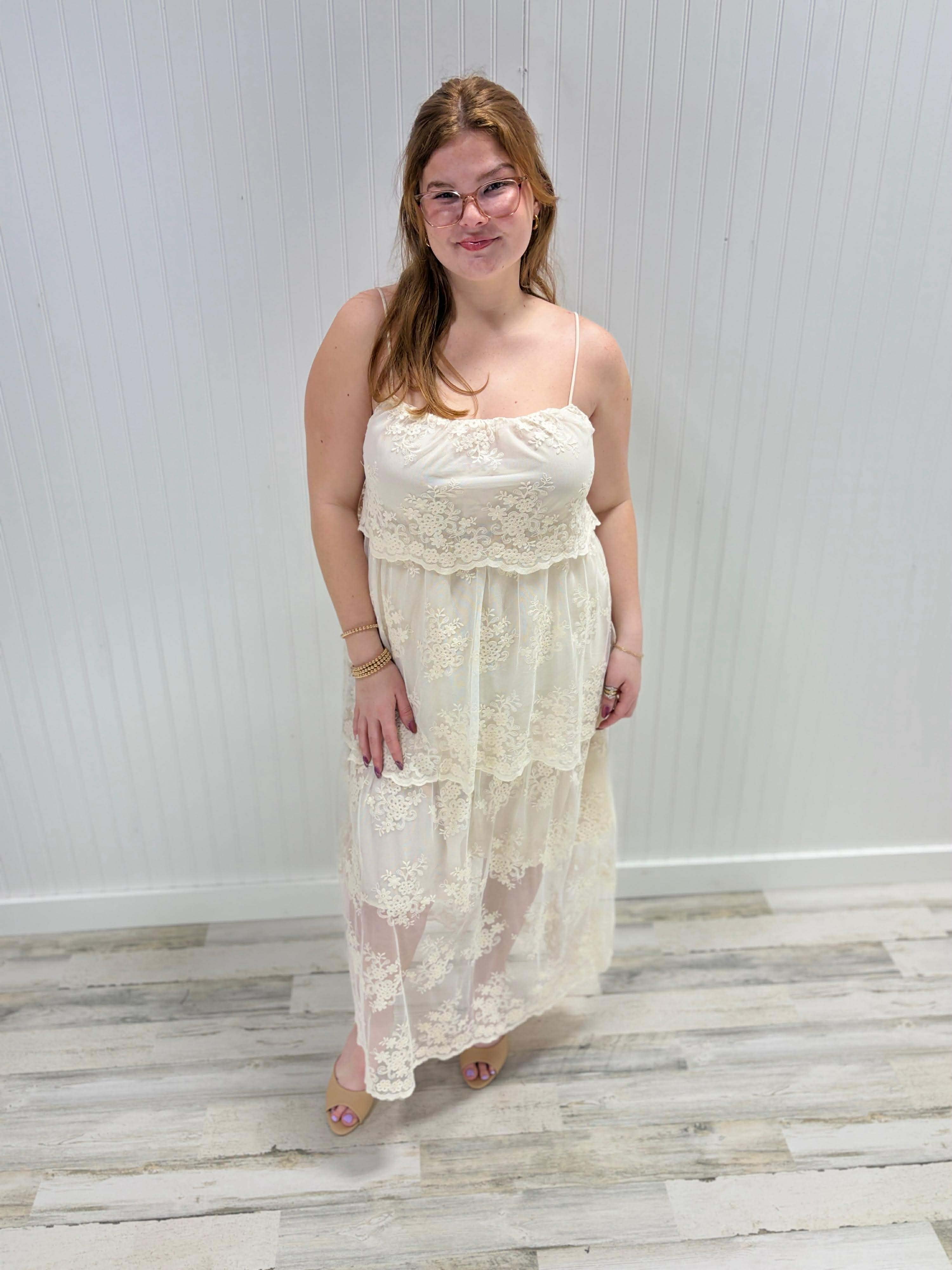 Romantic lace meets effortless elegance in this ivory stunner. Delicate floral embroidery dances across a sheer mesh overlay, while the relaxed A-line silhouette glides gracefully with every step. Straight neckline and thin straps keep things simple and chic, while the built-in mini lining gives you coverage up top and lets the sheer lower tier flow freely. Whether you're celebrating a bridal shower, spring soirée, or any special daytime moment, this pullover beauty in soft ivory is your go-to. Crafted from a breathable cotton-polyester blend for all-day comfort.