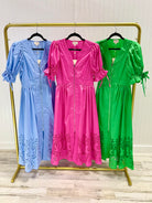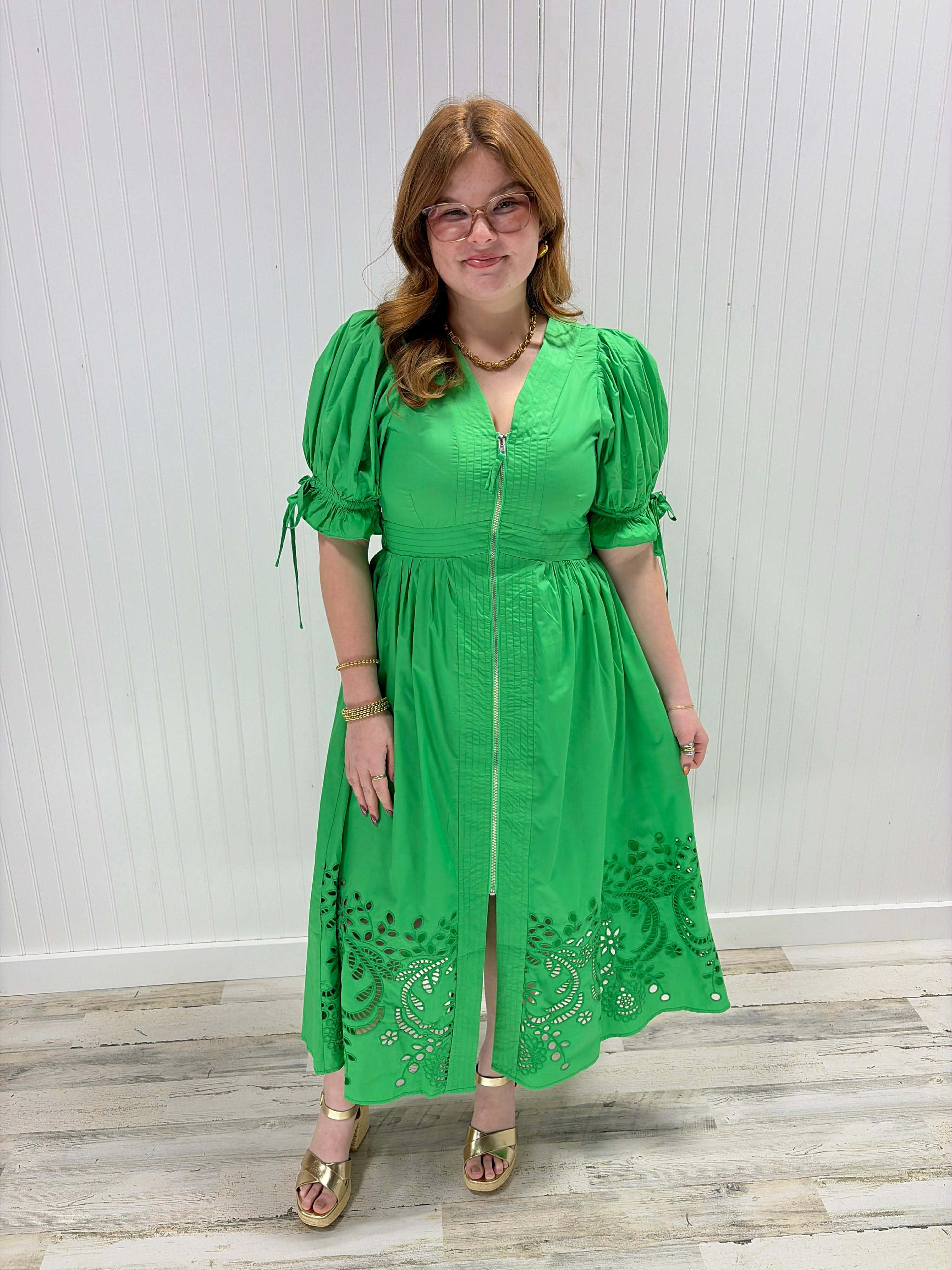 This charming midi dress brings effortless style with its playful puff sleeves and flattering V-neckline accented with delicate stitching. The embroidered hem adds a touch of whimsy, while the front zipper and smocked back waistband ensure a perfect fit. Crafted from lightweight woven fabric with a full lining for comfort and coverage, it's your go-to piece for looking put-together without trying too hard.