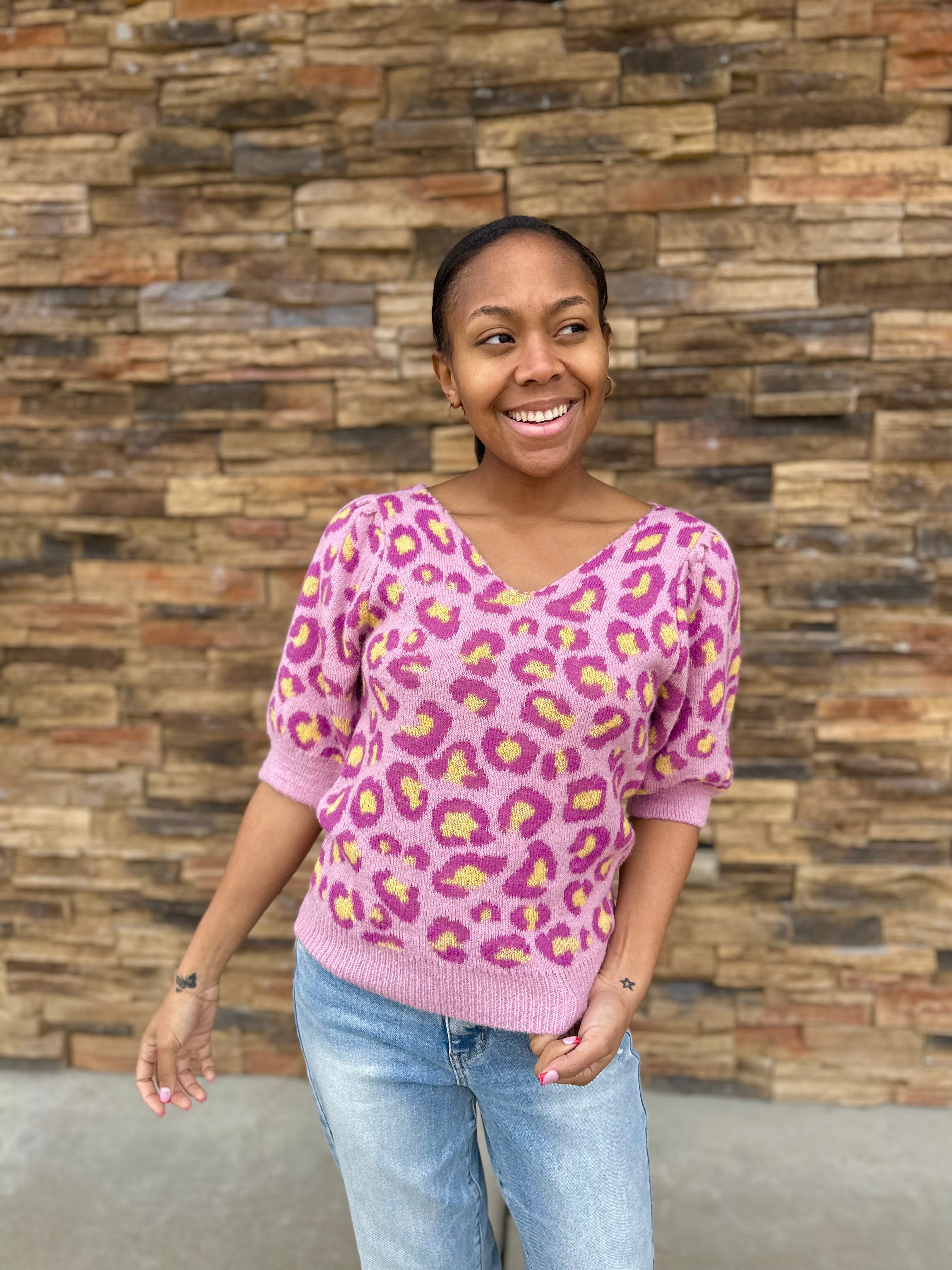 Unleash your wild side with the Selene Sweater! This playful leopard print will have you feeling fierce and fun. Show off your unique style with this trendy and cozy sweater.