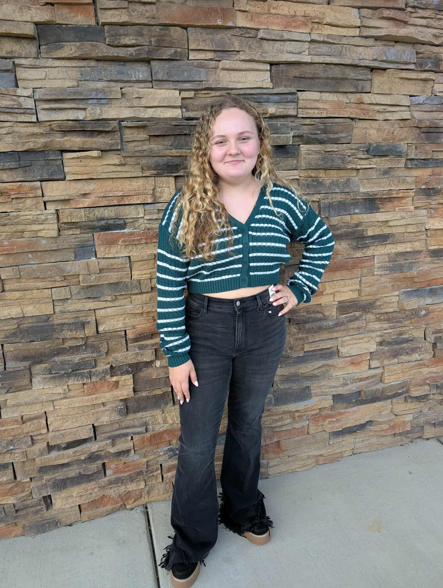 Add a splash of fun to your wardrobe with the Sheri Cardigan. Featuring playful green stripes, this cozy layering piece brightens any outfit while keeping you comfy and stylish. Perfect for those casual days when you want a little extra flair!