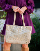 The Sophie Zippered Tote in Champagne Pop combines style and practicality with its lightweight quilted panels accented by subtle stud detailing. This spacious tote features a secure zip closure, a large interior compartment, and convenient organization pockets—a zippered pocket on one side and two open pockets on the other. Wide, soft straps ensure a comfortable, chic carry all day long. Perfect for those who want a fashionable yet functional accessory.