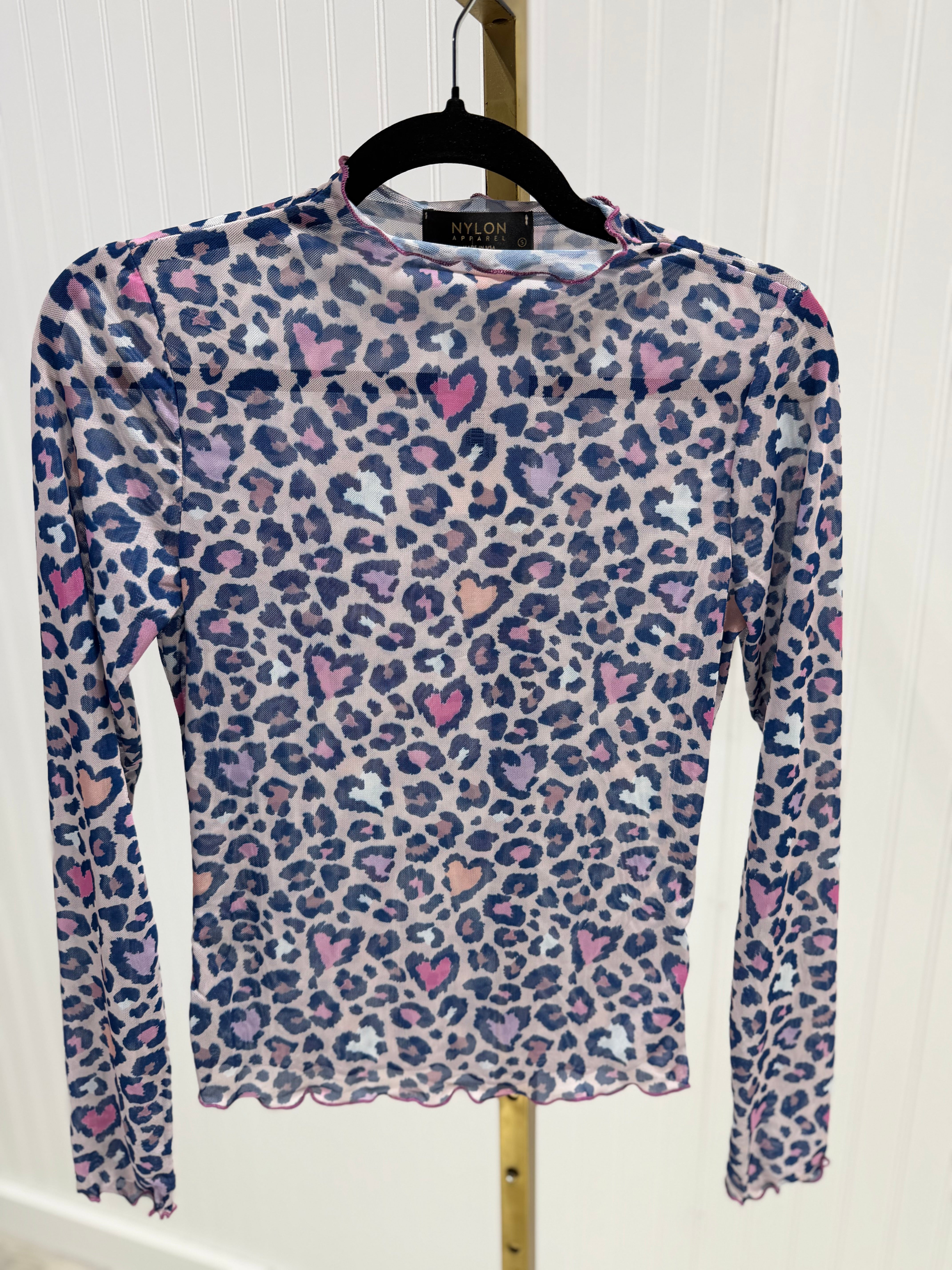 -Playful navy hearts meet wild animal print on this stretchy mesh essential. The mock neck and long sleeves deliver effortless style whether you're heading to a casual hangout or turning heads at a party. Lightweight enough for summer layering, cozy enough for fall transitions. Proudly made in USA.