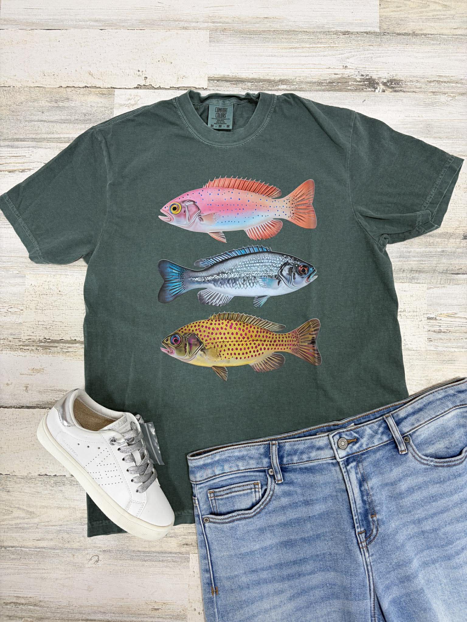 Dive into effortless style with this Three Fish Graphic Tee in a breezy Blue Spruce hue. Made from 100% cotton by Comfort Colors, this tee delivers that perfect combo of cozy softness and relaxed vibes—ideal for kicking back in comfort.