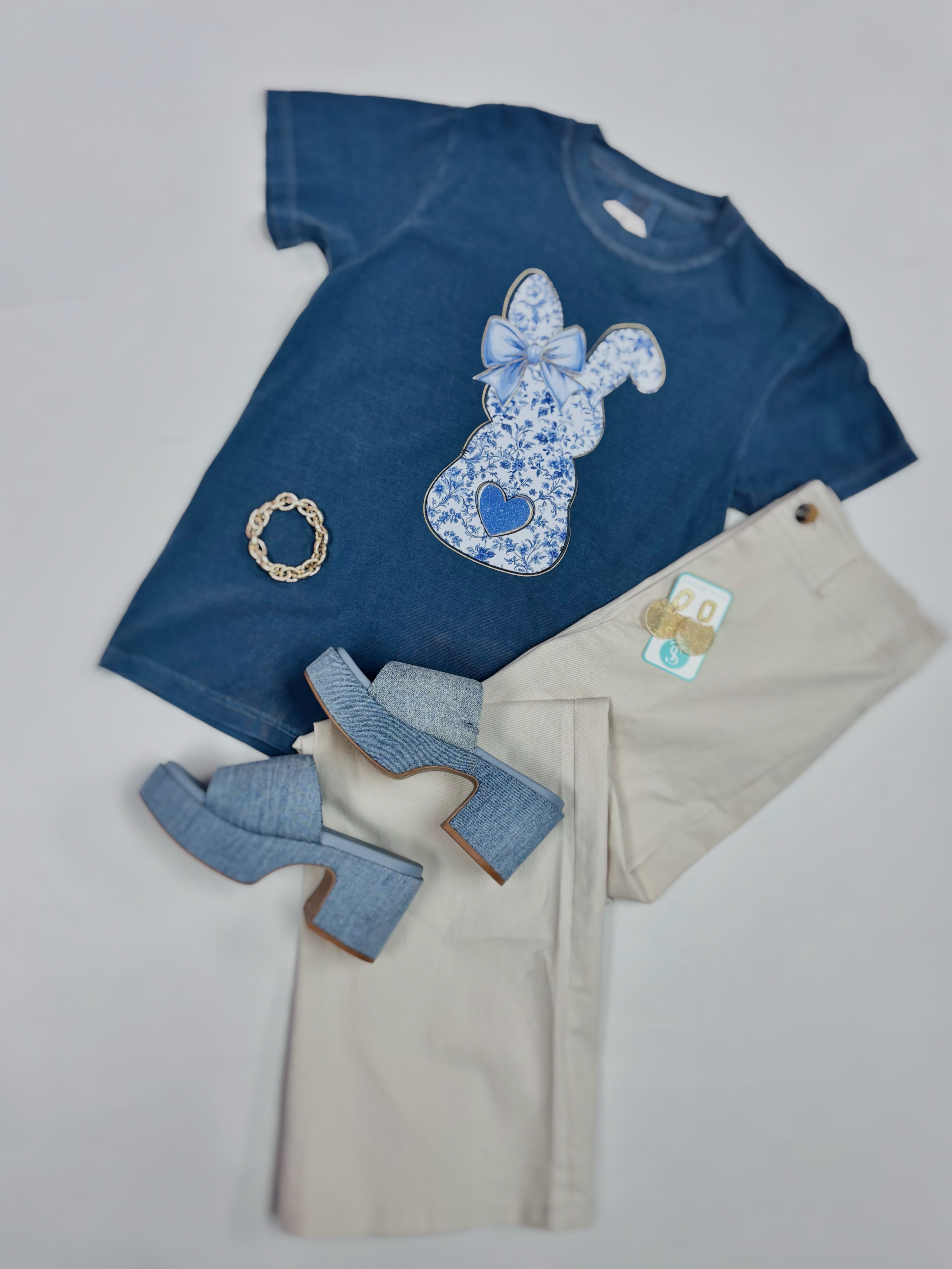 Hop into timeless style with our Toile Bunny Tee, featuring a charming blue willow bunny design that brings whimsical elegance to your everyday wardrobe. This classic tee combines soft comfort with vintage-inspired aesthetics, perfect for those who appreciate delicate details and playful sophistication. Whether you're dressing up a casual look or keeping it relaxed, this versatile piece adds a touch of character to any outfit.