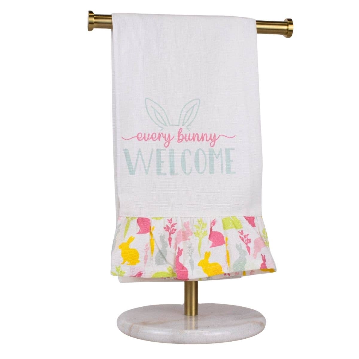 The Welcome Becker Bunny Ruffle Hand Towel White/Multi measures 20x28 inches and features an adorable bunny design with ruffled edges. Its soft and absorbent material makes it a perfect addition to any bathroom.
