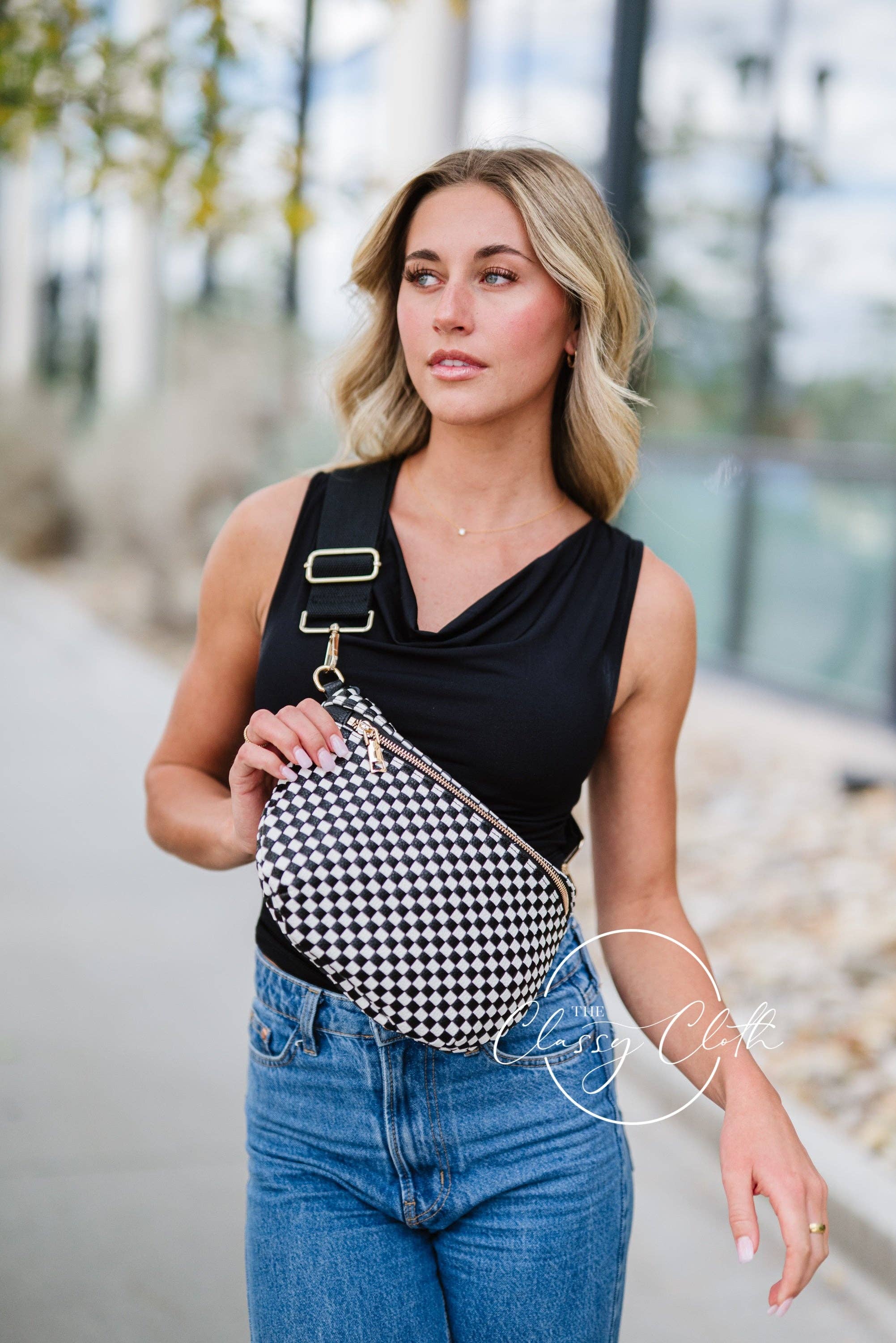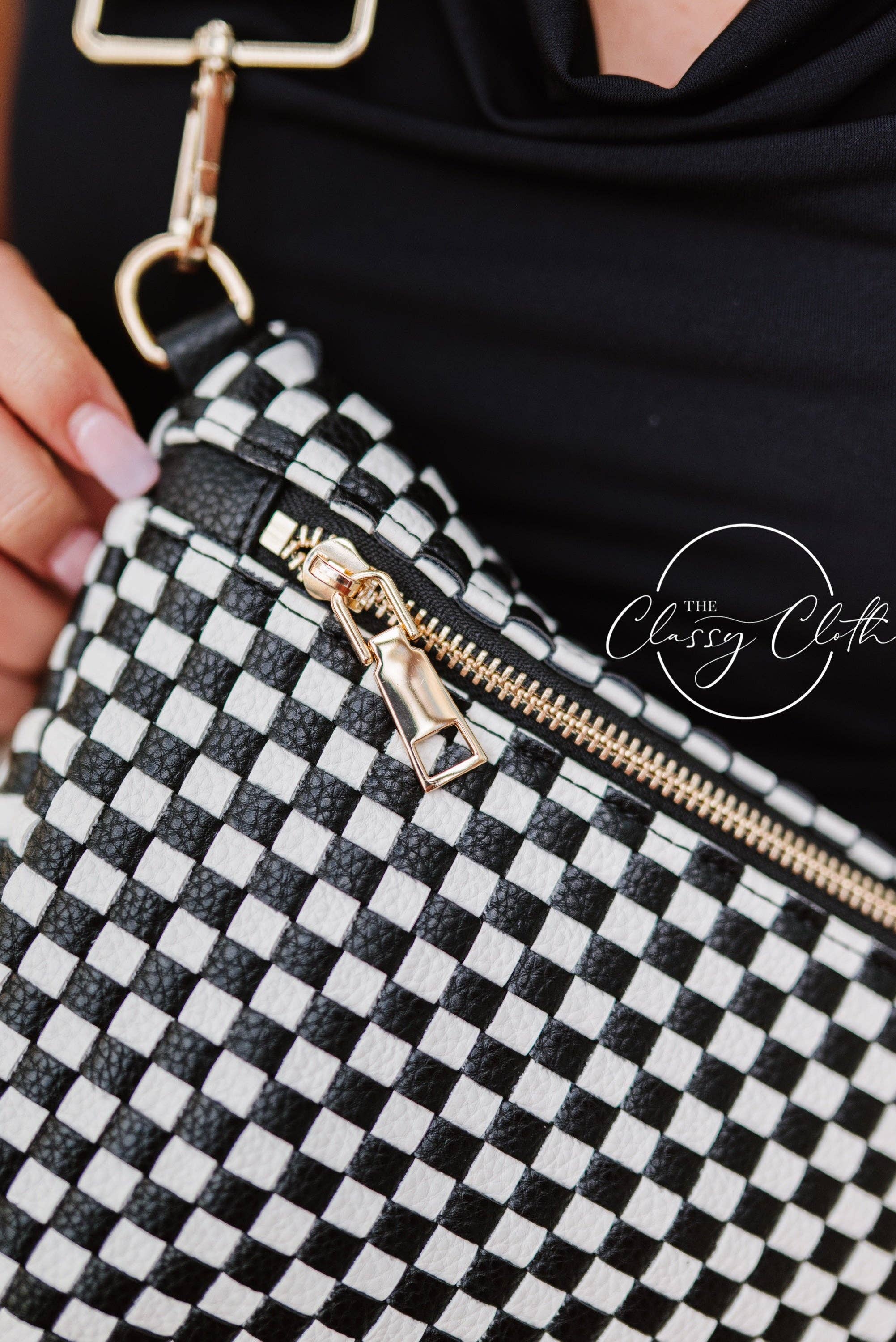 The Willa Woven Bum Bag Crossbody is your boutique’s go-to accessory for fall 2025, Christmas gifting, and game day style. Featuring a bold black and white checkered pattern with a sleek solid black strap, this bag delivers high-contrast edge with versatile appeal. With a spacious interior and adjustable fit, it can be worn crossbody or over the shoulder. Perfect for errands, events, or everyday edge, this bag pairs effortlessly with denim, knits, or leather looks. Dimensions: 12” L x 8” H x 24” W Strap Length: 46”